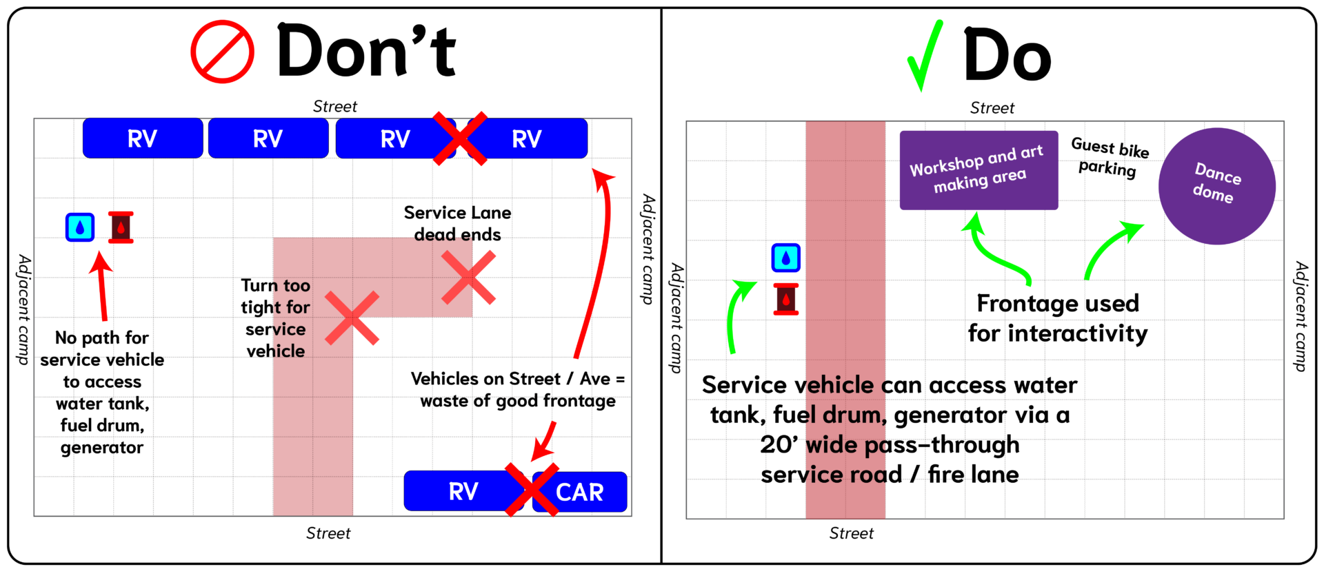 - Service access lanes must not include any sharp turns, trucks must be able to drive straight through to the street, and provide a clear and visible path. The lane should provide direct access to enter and exit your camp from a street that DO NOT require trucks to turn around or back out. This entrance should be unobstructed at all times and not blocked by vehicles or bikes. For more information: BRC Fuel Program.