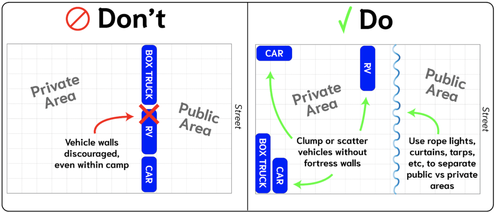| Do clearly mark where interactivity will be & what will be private camp space. | Don’t put private portos and RVs with generators exhausting on your neighbors. |