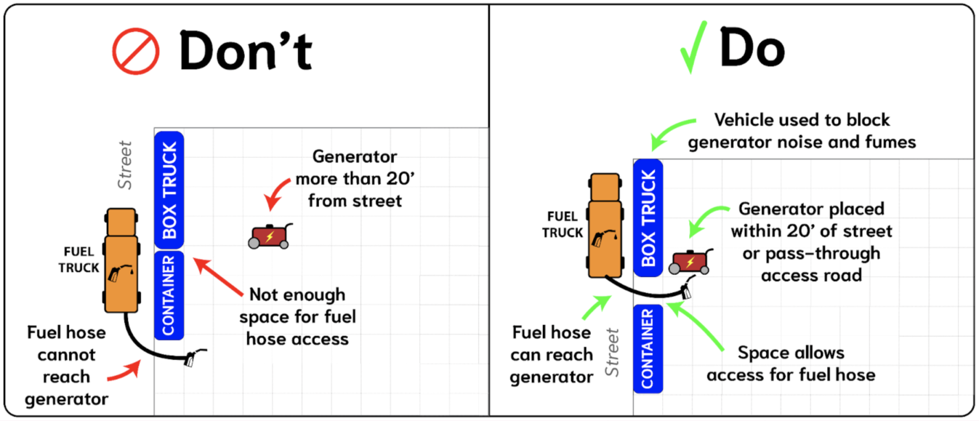 - Generators located close to the street can still remain hidden behind a structure, such as a container, so long as the fuel truck hose can reach it from the street (20’ length with relatively straight access and no obstructions to the walking path)