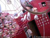 Participants enter the Cradle by passing through one of three 6-foot vaginal openings that flank the bassinet. When they have passed through the stretchy fabric lips of the vagina, they find themselves in the dark and cushioned Womb, listening to soothing lullabies. They are birthed into the 16 X 16 foot cradle proper, where they are spanked as a welcome to life. The “baby” is immediately overwhelmed and immersed in the brilliantly colored rainbow sea of balls, through which they must crawl towards the bassinet area, which symbolizes the comfort and security of the Mother’s embrace. Upon reaching the end of the Playpen area, the baby must crawl beneath the red curtain that covers the Bassinet, and enters the rich and intimate inner sanctuary. Purple carpeting covers the floor and curved seating platforms, and Mommy’s 6′ breasts dangle enticingly overhead. Upon reaching the top platform, Baby is coaxed to speak his/her first word, and receives the stamp of the cradle, before exiting via a steel slide that takes one into the Playground. The Cradle allows participants to experience the wonder and excitement of birth and the overwhelming sensory overload associated with viewing the world for the first time as a newborn, and finally, the warmth and security of resting in the Cradle of the mother’s arms.