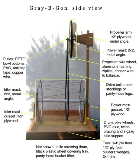 - Install an evapotron in your camp: Evapotrons are Burner-built devices for evaporating gray water in the playa’s intensely dry air. The Pumped Cascade design is powered by sunlight on a solar cell; the Gray-B-Gon is powered by a small windmill. Either design can meet the disposal needs of ten or more people.