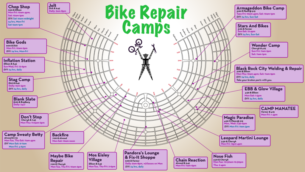 Remember that bike repair theme camps are Burners giving these services – don’t take them for granted and show your appreciation! It’s always great if you have spare tubes, parts, or equipment to offer since they may not have exactly what you need. And know that most are there to help with basic issues and they may not be able to fix very specialized parts/needs (including the needs of e-bikes).