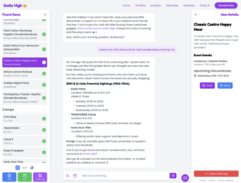 Meet Dusty! The sassy AI guide who’s braved 25 years of Burning Man, here to help you find your way through this eccentric dust bowl without losing your mind—or your shoes. Don’t expect warm hugs, but do expect salty wisdom in the quest for art cars and existential revelations!