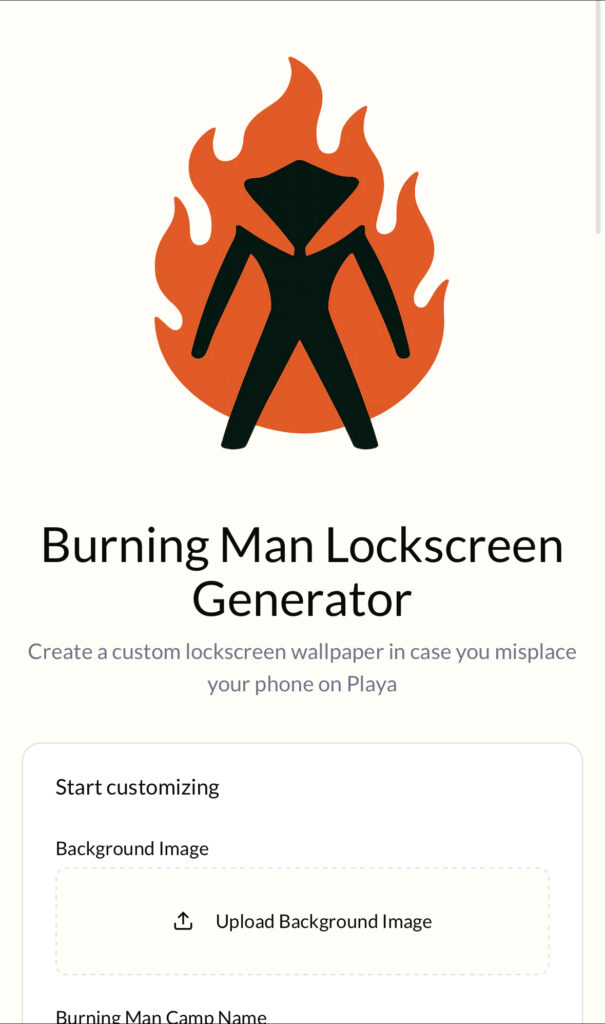 I made a Burning Man lockscreen generator, because phones—like some Burners—tend to wander off and “find themselves.” Now, if your phone decides to take its own spiritual journey across the playa, at least it’ll be rocking a custom lockscreen with your camp info and contact deets. Think of it as a stylish “lost and found” billboard… but hotter (and dustier). Pick a trippy background, slap on your details, and boom—you’ve just made your phone 73% more likely to find its way home. 🔥 📱 💨