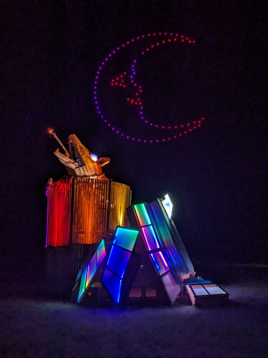 In addition to numerous theme camps and art projects on playa every year, the Austin community contributed the Blind Tiger (2016-2018) project, Wooden Nickel Carnival (2015), Souk (2014), Temple of Times (2013 CORE project), The Ouroborous (2011 CORE project), the Temple of Fire (2009) and the 1000 Hands (2023 Burning Man Honorarium Artwork).