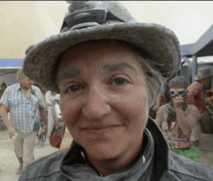 She is a lot of things. It’s gonna take me about 10 minutes just to read her CV. First of all, she’s an artist. She is a longtime member of the metal art collective, the Iron Monkeys. She is a member of the Burning Man Meta Regionals Committee. If you don’t know what that is, we’ll ask, we’ll find out about it. She is a co-host of The Burn Barrel podcast, which is why you’ve probably heard her voice before I believe, not too long ago, she was here on this program talking about that. And she is — little drum roll — she is a member of the Board of Directors of Burning Man Project.
