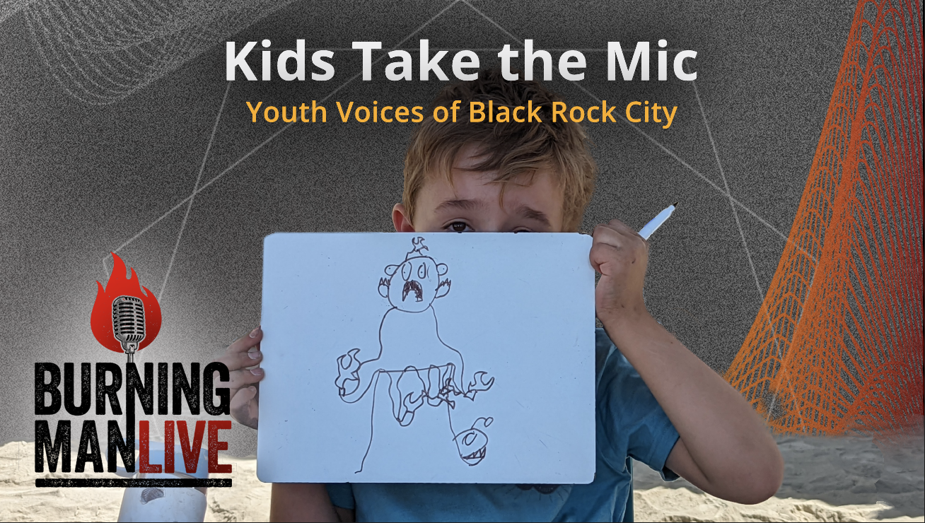 For full disclosure, these twin brothers, Atticus and Colby, are the sons of Coyote and Mel. But hey, who better to interview about having family at BRC. We also hear from StAbby, aka Abby Ehmann, a longtime DPW Manager, and from Tamsin a DPW Volunteer and creative ceramics artist. The episode rounds up with a couple of fun clips from young kids talking on air at the playa’s main radio station BMIR.